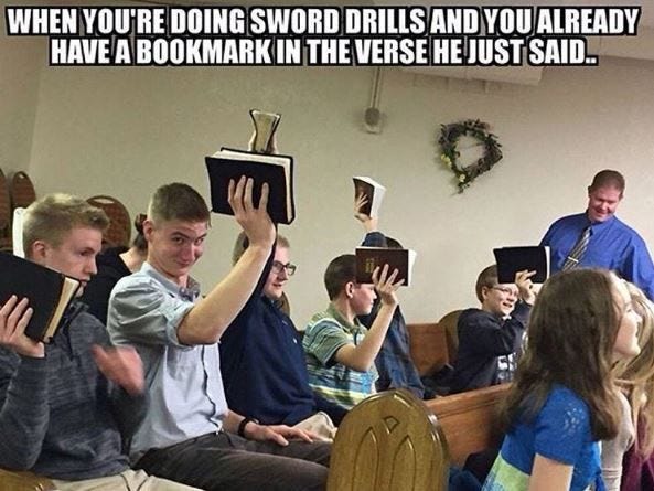 So, based on my inadequate memorizing, I felt I was constantly disappointing Jesus. Sure, I could make my way around the Bible well enough to win a sword drill or two (see below), and I found the academics of my Christian high school’s bible class fascinating (you better believe I can recite the precise order of the weirdest prophets in the Bible’s nether regions), but imprinting entire chapters in order, word-for-word, onto my heart? That was never going to happen.